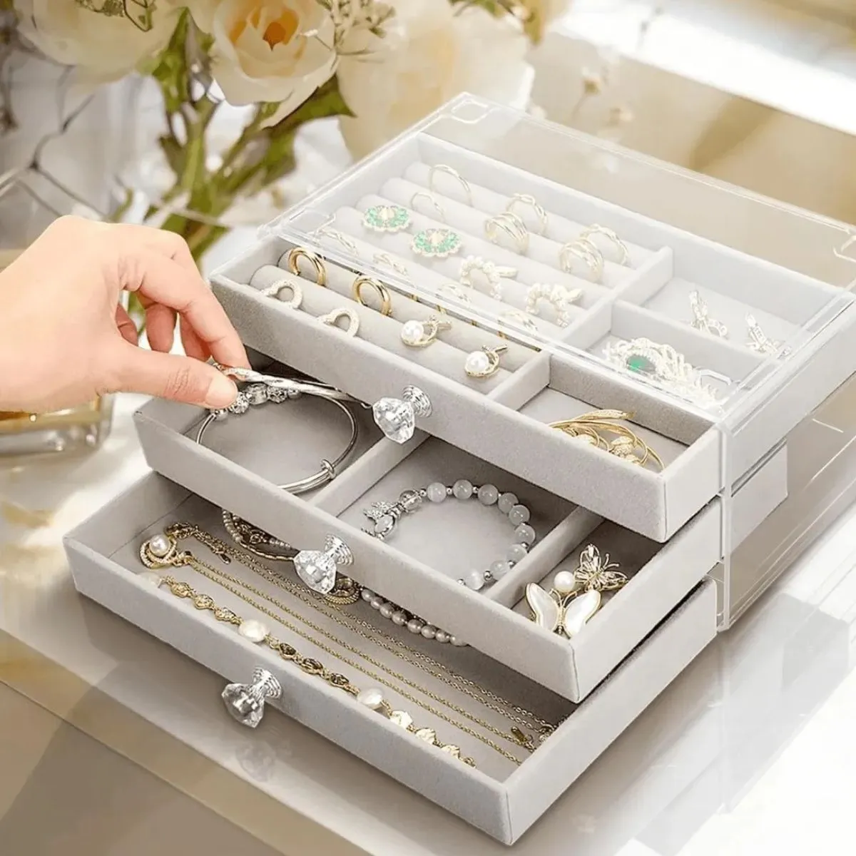 Este alhajero es ideal para mantener tus accesorios ordenados y protegidos en un solo lugar. Su interior suave cuida cada pieza, mientras que los cajones y compartimentos facilitan la organización diaria. Funcional, prolijo y con un diseño limpio que acompaña cualquier espacio.
