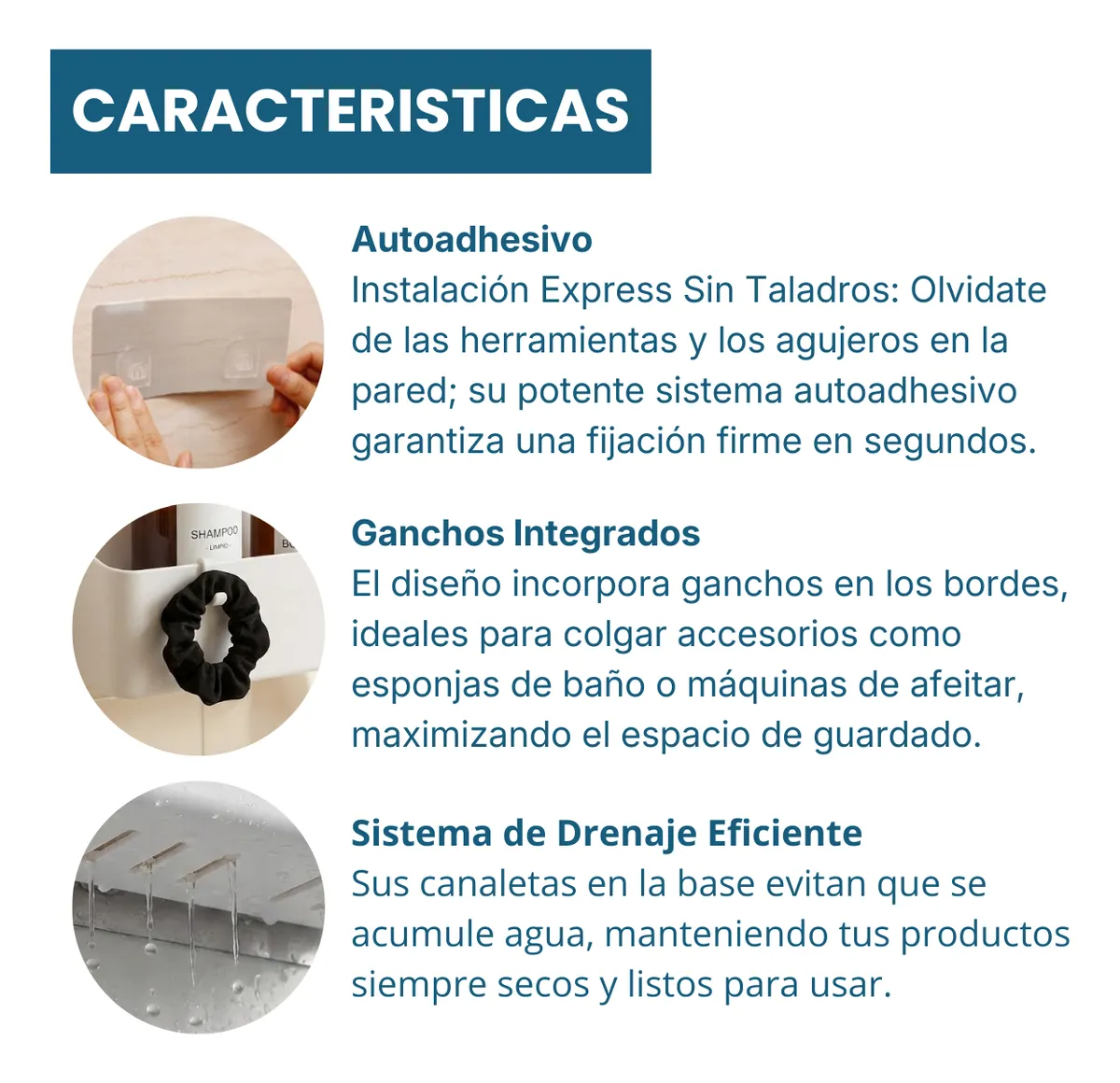 Ideal para aprovechar mejor el espacio, mantener todo a mano y evitar apoyos incómodos. Ayuda a que el baño se vea más prolijo, liviano y organizado, sin complicaciones ni instalaciones invasivas.