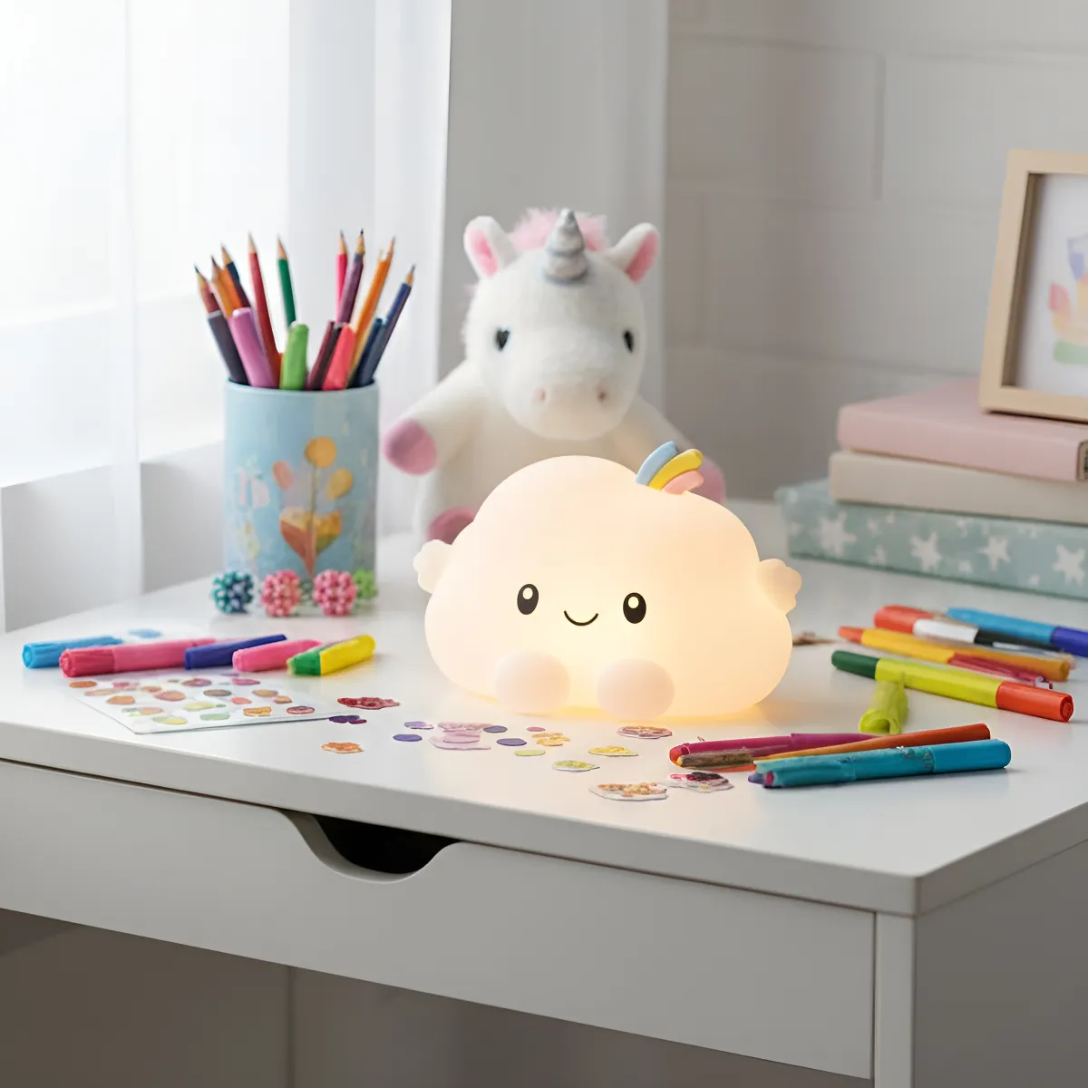 Velador infantil en forma de nube diseñado para aportar un toque decorativo y luminoso en cualquier habitación. Su tamaño compacto y diseño suave lo hace perfecto para acompañar momentos de lectura, juego o descanso.