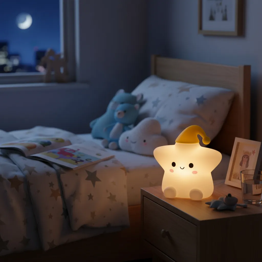 Velador infantil en forma de estrella diseñado para aportar un toque decorativo y luminoso en cualquier habitación. Su tamaño compacto y diseño suave lo hace ideal para acompañar momentos de lectura, juego o descanso.